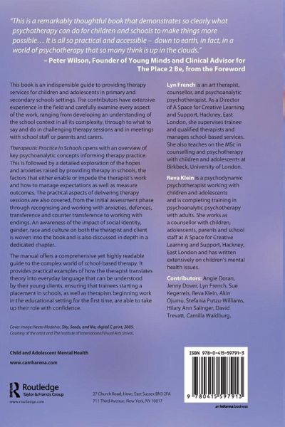 This book is an indispensable guide to providing therapy services for children and adolescents in primary and secondary school settings. The contributors have extensive experience in the field and carefully examine every aspect of the work, ranging from developing an understanding of the school context in all its complexity, through to what to say and do in challenging therapy sessions and in meetings with school staff or parents and carers. Therapeutic Practice in Schools opens with an overview of key psychoanalytic concepts informing therapy practice. This is followed by a detailed exploration of the hopes and anxieties raised by providing therapy in schools, the factors that either enable or impede the therapist's work and how to manage expectations as well as measure outcomes. The practical aspects of delivering therapy sessions are also covered, from the initial assessment phase through recognising and working with anxieties, defences, transference and counter-transference to working with endings. An awareness of the impact of social identity, gender, race and culture on both the therapist and client is woven into the book and is also discussed in depth in a dedicated chapter. The manual offers a comprehensive yet highly readable guide to the complex world of school-based therapy. It provides practical examples of how therapists translate theory into everyday language that can be understood by their young clients, ensuring that trainees starting a placement in schools, as well as therapists beginning work in the educational setting for the first time, are able to take up their role with confidence.