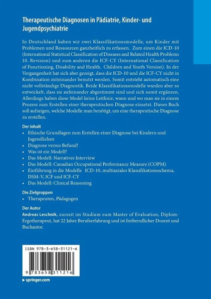 In Deutschland haben wir zwei Klassifikationsmodelle, um Kinder mit Problemen und Ressourcen ganzheitlich zu erfassen. Zum einen die ICD-10 (International Statistical Classification of Diseases and Related Health Problems 10. Revision) und zum anderen die ICF-CY (International Classification of Functioning, Disability and Health. Children and Youth Version). In der Vergangenheit hat sich aber gezeigt, dass die ICD-10 und die ICF-CY nicht in Kombination miteinander benutzt werden. Somit entsteht automatisch eine nicht vollständige Diagnostik. Beide Klassifikationsmodelle wurden aber so entwickelt, dass sie aufeinander abgestimmt sind und sich somit ergänzen. Allerdings haben diese Model keine Leitlinie, wann und wo man sie in einem Prozess zum Erstellen einer therapeutischen Diagnose einsetzt. Dieses Buch soll aufzeigen, welche Modelle man benötigt, um eine therapeutische Diagnose zu erstellen.