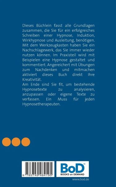 Dieses Büchlein fasst alle Grundlagen zusammen, die Sie für ein erfolgreiches Schreiben einer Hypnose, Induktion, Wirkhypnose und Ausleitung, benötigen. Mit dem Werkzeugkasten haben Sie ein Nachschlagewerk, das Sie immer wieder nutzen können. Im Praxisteil wird mit Beispielen eine Hypnose gestaltet und kommentiert. Angereichert mit Übungen zum Nachdenken und mitmachen aktiviert dieses Buch direkt Ihre Kreativität.Am Ende sind Sie fit, um bestehende Hypnosetexte zu analysieren, anzupassen oder eigene Texte zu verfassen. Ein Muss für jeden Hypnosetherapeuten