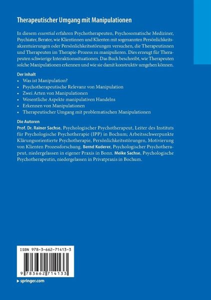 In diesem essential erfahren Psychotherapeuten, Psychosomatische Mediziner, Psychiater, Berater, wie Klientinnen und Klienten mit sogenannten Persönlichkeitsakzentuierungen oder Persönlichkeitsstörungen versuchen, die Therapeutinnen und Therapeuten im Therapie-Prozess zu manipulieren. Dies erzeugt für Therapeuten schwierige Interaktionssituationen. Das Buch beschreibt, wie Therapeuten solche Manipulationen erkennen und wie sie damit konstruktiv umgehen können.