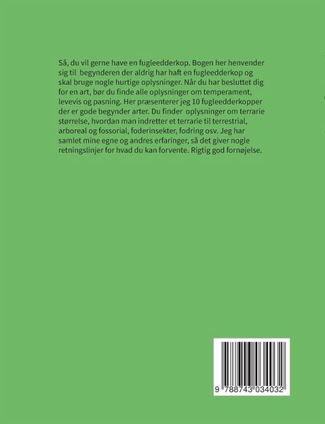 Bogen henvender sig til nybegynderen der har brug for nogle hurtige oplysninger omkring fugleedderkopper som kæledyr. Her præsenterer jeg 10 begynder fugleedderkopper samt oplysninger om hvor de kommer fra og hvordan de lever. Du finder oplysninger om, hvad du skal bruge som bolig til edderkoppen, indretning af tre forskellige terrarier, bundlevende, trælevende og tunnelgravende fugleedderkopper. Levende foderinsekter, hvordan du opbevarer dem, hvordan og hvor ofte du skal fodre. Generelle oplysninger om pasning, temperatur, fugtighed og hamskifte. Skal eller skal ikke håndtere fugleedderkopper, et varmt emne og sidst men ikke mindst oplysninger om gener ved nældehår og et evt. bid.