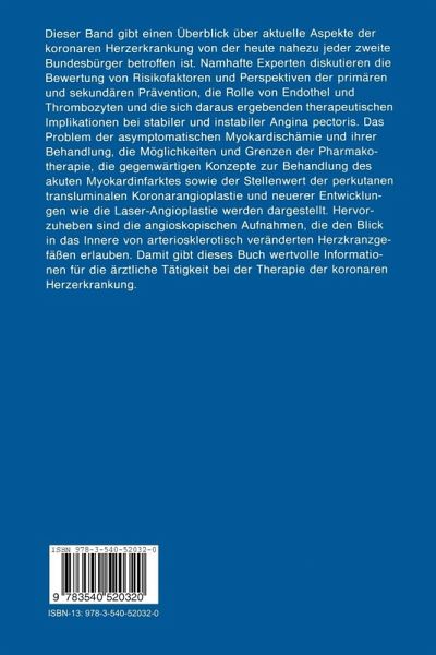 Dieser Band gibt einen Überblick über aktuelle Aspekte der koronaren Herzkrankheit, von der heute nahezu jeder 2. Bundesbürger betroffen ist. Namhafte Experten diskutieren die Bewertung von Risikofaktoren und Perspektiven der primären und sekundären Prävention, die Rolle von Endothel und Thrombozyten und die sich daraus ergebenden therapeutischen Implikationen bei stabiler und instabiler Angina pectoris. Das Problem der asymptomatischen Myokardischämie und ihrer Behandlung, die Möglichkeiten und Grenzen der Pharmakotherapie, die gegenwärtigen Konzepte zur Behandlung des akuten Myokardinfarktes sowie der Stellenwert der PTCA und neuerer Entwicklungen wie die Laser-Angioplastie werden dargestellt. Hervorzuheben sind die angioskopischen Aufnahmen, die den Blick in das Innere von arteriosklerotisch veränderten Herzkranzgefäßen erlauben. Damit gibt dieses Buch wertvolle Informationen für die ärztliche Tätigkeit bei der Therapie der koronaren Herzkrankheit.