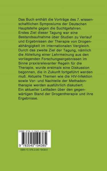Das Buch enthält die Vorträge des 7. Wissenschaftlichen Symposiums der Deutschen Hauptstelle gegen die Suchtgefahren. Erstes Ziel dieser Tagung war eine Bestandsaufnahme über Studien zu Verlauf und Ergebnissen der Therapie von Drogenabhängigkeit im internationalen Vergleich. Durch das zweite Ziel der Tagung, nämlich die Ableitung einer Lehrmeinung aus den vorliegenden Forschungsergebnissen im Sinne praxisrelevanter Regeln für die Therapie, wurde erstmals eine Diskussion begonnen, die in Zukunft fortgeführt werden muß. Aktuelle Themen wie die HIV-Infektion sowie Vor- und Nachteile der Methadontherapie werden ausführlich diskutiert. Ein aktueller Leitfaden über den gegenwärtigen Stand der Drogentherapie und ihre Ergebnisse.