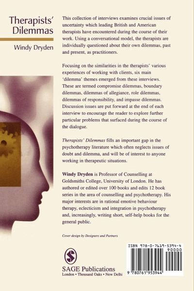 Seminars by Professor Windy Dryden. See the man live and in action. To find out more and to book your place go to www.cityminds.com ________________________________________ `This book is really about how therapists resolve discomforting conflicts and what such conflicts reveal about the nature of therapy. Windy Dryden approaches this task by way of a series of interviews with experienced therapists from a range of therapeutic backgrounds... the interviews are both readable and engaging... and often give us as much insight into the therapists themselves as to the dilemmas.... This book would clearly serve as a useful source of discussion for students of therapy or counselling. It is also a thoughtful and interesting read for any practitioner' - Clinical Psychology Forum This collection of interviews examines crucial issues of uncertainty which leading British and American therapists have encountered during the course of their work. This revised edition includes a new chapter by Tim Bond. Using a conversational model, the therapists are questioned about their own dilemmas, past and present, as practitioners. Focusing on the similarities in the therapists' experiences of working with clients, six main `dilemma' themes emerged from these interviews: compromise dilemmas, boundary dilemmas, dilemmas of allegiance, role dilemmas, dilemmas of responsibility and impasse dilemmas. Discussion issues are put forward at the end of each interview to encourage readers to explore further particular problems that surfaced during the course of the dialogue.