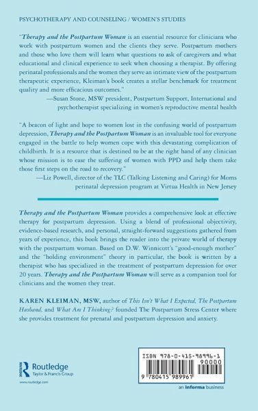 "Karen Kleiman brings to light the unique clinical and social context of the postpartum woman seeking therapy. Karen adeptly encapsulates the practical aspects of working with postpartum women. She highlights the importance of clinician qualities of warmth, compassion and empathic confidence for establishing a strong therapeutic relationship and a supportive 'holding environment' for the new mother."