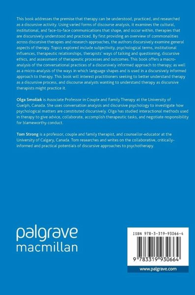 This book addresses the premise that therapy can be understood, practiced, and researched as a discursive activity. Using varied forms of discourse analysis, it examines the cultural, institutional, and face-to-face communications that shape, and occur within, therapies that are discursively understood and practiced. By first providing an overview of commonalities across discursive therapies and research approaches, the authors discursively examine general aspects of therapy. Topics explored include subjectivity, psychological terms, institutional influences, therapeutic relationships, therapists' ways of talking and questioning, discursive ethics, and assessment of therapeutic processes and outcomes. This book offers a macro-analysis of the conversational practices of a discursively informed approach to therapy; as well as a micro-analysis of the ways in which language shapes and is used in a discursively informed approach to therapy. This book will interest practitioners seeking to better understand therapy as a discursive process, and discourse analysts wanting to understand therapy as discursive therapists might practice it.