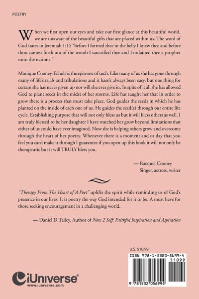 When we first open our eyes and take our first glance at this beautiful world, we are unaware of the beautiful gifts that are placed within us. The word of God states in Jeremiah 1:15 "before I formed thee in the belly I knew thee and before thou camest forth out of the womb I sanctified thee and I ordained thee a prophet unto the nations." Monique Cooney-Echols is the epitome of such. Like many of us she has gone through many of life's trials and tribulations and it hasn't always been easy, but one thing for certain she has never given up nor will she ever give in. In spite of it all she has allowed God to plant seeds in the midst of her storms. Life has taught her that in order to grow there is a process that must take place. God guides the seeds in which he has planted on the inside of each one of us. He guides the seed(s) through our entire life cycle. Establishing purpose that will not only bless us but it will bless others as well. I am truly blessed to be her daughter I have watched her grow beyond limitations that either of us could have ever imagined. Now she is helping others grow and overcome through the heart of her poetry. Whenever there is a moment and or day that you feel you can't make it through I guarantee if you open up this book it will not only be therapeutic but it will TRULY bless you. Racquel Cooney Singer, actress, writer
