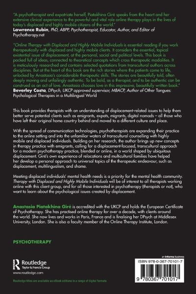 With the spread of communication technologies, psychotherapists are expanding their practice to the online setting and into the unfamiliar waters of transcultural counselling with highly mobile and displaced individuals. Building on her research, the author brings up new concepts in therapy practice with emigrants, calling for a displacement-focused, transcultural approach for a modern psychotherapy practice, blended or online, in a world shaped by ubiquitous displacement. Giré's own experience of relocations and multicultural families have helped her develop a personal approach to universal topics of the therapeutic endeavour, such as displacement, multilingualism, and shame.
