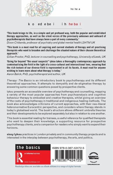Therapy: The Basics is an introductory book to psychotherapy and its different theoretical approaches. It attempts to demystify and de-stigmatise therapy by answering some common questions posed by prospective clients.