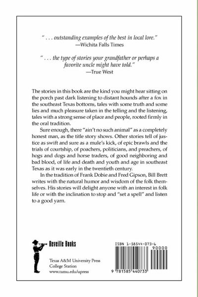 The stories in this book are the kind you might hear sitting on the porch past dark listening to distant hounds after a fox in the southeast Texas bottoms, tales with some truth and some lies and much pleasure take in the telling and the listening, tales with a strong sense of place and people, rooted firmly in the oral tradition. Sure enough, there "ain't no such animal" as a completely honest man, as the title story shows. Other stories tell of justice as swift and sure as a mule's kick, of epic brawls and the trials of courtship, of poachers, politicians, and preachers, of hogs and dogs and horse traders, of good neighboring and bad blood, of life and death and youth and age in southeast Texas as it was early in the twentieth century. In the tradition of Frank Dobie and Fred Gipson, Bill Brett writes with the natural humor and wisdom of the folk themselves. His stories will delight anyone with an interest in folk life or with the inclination to stop and "set a spell" and listen to a good yarn.