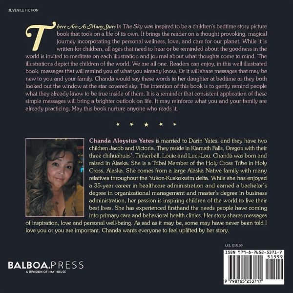 There Are As Many Stars In The Sky was inspired to be a children's bedtime story picture book that took on a life of its own. It brings the reader on a thought provoking, magical journey incorporating the personal wellness, love, and care for our planet. While it is written for children, all ages that need to hear or be reminded about the goodness in the world is invited to meditate on each illustration and journal about what thoughts come to mind. The illustrations depict the children of the world. We are all one. Readers can enjoy, in this well illustrated book, messages that will remind you of what you already know. Or it will share messages that may be new to you and your family. Chanda would say these words to her daughter at bedtime as they both looked out the window at the star covered sky. The intention of this book is to gently remind people what they already know to be true inside of them. It is a reminder that consistent application of these simple messages will bring a brighter outlook on life. It may reinforce what you and your family are already practicing. May this book nurture anyone who reads it.
