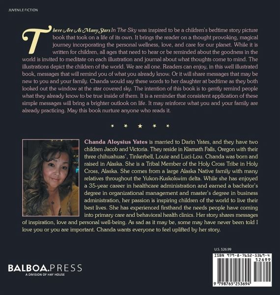 There Are As Many Stars In The Sky was inspired to be a children's bedtime story picture book that took on a life of its own. It brings the reader on a thought provoking, magical journey incorporating the personal wellness, love, and care for our planet. While it is written for children, all ages that need to hear or be reminded about the goodness in the world is invited to meditate on each illustration and journal about what thoughts come to mind. The illustrations depict the children of the world. We are all one. Readers can enjoy, in this well illustrated book, messages that will remind you of what you already know. Or it will share messages that may be new to you and your family. Chanda would say these words to her daughter at bedtime as they both looked out the window at the star covered sky. The intention of this book is to gently remind people what they already know to be true inside of them. It is a reminder that consistent application of these simple messages will bring a brighter outlook on life. It may reinforce what you and your family are already practicing. May this book nurture anyone who reads it.
