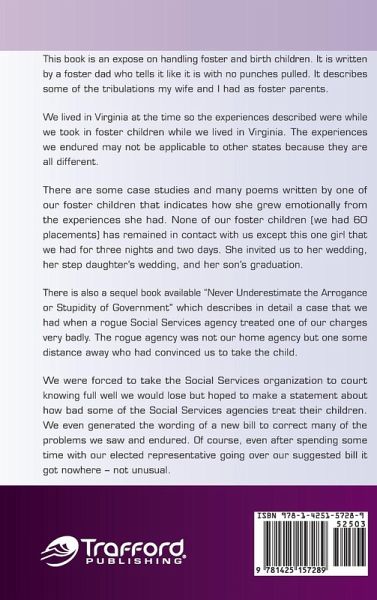 This book was written as a result of the author and his wife spending several years providing for kids who needed a home. There are many, many books written on the subject of Òat riskÓ children and/or foster children. Most, if not all, are written by clinical psychologists or other Ôpeople of learningÕ who believe that they are child advocates. NOT THIS ONE! This one tells it like it really is! After the mandatory hours of ÔtrainingÕ (which were not needed because of raising four birth children and a teenager the boys had adopted) the author and his wife began accepting foster children. The book describes how the foster parent feels about raising foster children (and birth children). He relates from the experiences of a foster dad rather than from a clinical slant. The information, of course, applies to birth children, as well. Much information is presented to assist parents in dealing with the problems of puberty. Case studies are included as well as poems from one of the foster girls and a diary from another foster parent about her dealings with two foster children. The sequel to this book is entitled: 'Never Underestimate the Arrogance or Stupidity of Government' and covers a case in which the foster parents sued Child Protective Services for mistreatment of them as foster parents and one of their foster children. It cost them $10,000 and they were sure they would lose, but they wanted to make a statement about the screwed up system.