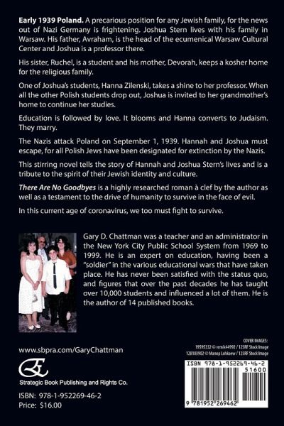 Early 1939 Poland. A precarious position for any Jewish family, for the news out of Nazi Germany is frightening. Joshua Stern lives with his family in Warsaw. His father, Avraham, is the head of the ecumenical Warsaw Cultural Center and Joshua is a professor there. His sister, Ruchel, is a student and his mother, Devorah, keeps a kosher home for the religious family. One of Joshua's students, Hanna Zilenski, takes a shine to her professor. When all the other Polish students drop out, Joshua is invited to her grandmother's home to continue her studies. Education is followed by love. It blooms and Hanna converts to Judaism. They marry. The Nazis attack Poland on September 1, 1939. Hannah and Joshua must escape, for all Polish Jews have been designated for extinction by the Nazis. This stirring novel tells the story of Hannah and Joshua Stern's lives and is a tribute to the spirit of their Jewish identity and culture. There Are No Goodbyes is a highly researched roman à clef by the author as well as a testament to the drive of humanity to survive in the face of evil. In this current age of coronavirus, we too must fight to survive. (About the Author) Gary D. Chattman was a teacher and an administrator in the New York City Public School System from 1969 to 1999. He is an expert on education, having been a "soldier" in the various educational wars that have taken place. He has never been satisfied with the status quo, and figures that over the past decades he has taught over 10,000 students and influenced a lot of them. He is the author of 14 published books.