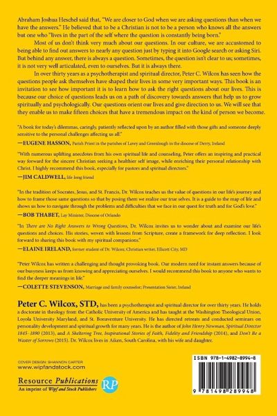 Abraham Joshua Heschel said that, ""We are closer to God when we are asking questions than when we have the answers."" He believed that to be a Christian is not to be a person who knows all the answers but one who ""lives in the part of the self where the question is constantly being born."" Most of us don't think very much about our questions. In our culture, we are accustomed to being able to find out answers to nearly any question just by typing it into Google search or asking Siri. But behind any answer, there is always a question. Sometimes, the question isn't clear to us; sometimes, it is not very well articulated, even to ourselves. But it is always there. In over thirty years as a psychotherapist and spiritual director, Peter C. Wilcox has seen how the questions people ask themselves have shaped their lives in some very important ways. This book is an invitation to see how important it is to learn how to ask the right questions about our lives. This is because our choice of questions leads us on a path of discovery towards answers that help us to grow spiritually and psychologically. Our questions orient our lives and give direction to us. We will see that they enable us to make fifteen choices that have a tremendous impact on the kind of person we become. ""A book for today's dilemmas, caringly, patiently reflected upon by an author filled with those gifts and someone deeply sensitive to the personal challenges affecting us all."" --Eugene Hasson, Parish Priest in the parishes of Lavey and Greenlough in the diocese of Derry, Ireland ""With numerous uplifting anecdotes from his own spiritual life and counseling, Peter offers an inspiring and practical way forward for the sincere Christian seeking a healthier self image, while enriching their personal relationship with Christ. I highly recommend this book, especially for pastors and spiritual directors."" --Jim Caldwell, life-long friend ""In the tradition of Socrates, Jesus, and St. Francis, Dr. Wilcox teaches us the value of questions in our life's journey and how to frame those same questions so that by posing them we realize our true selves. It is a guide to the map of life and shows us how to navigate through the problems and difficulties that we face in our quest for truth and for God's love."" --Bob Thabet, Lay Minister, Diocese of Orlando ""In There are No Right Answers to Wrong Questions, Dr. Wilcox invites us to wonder about and examine our life's questions and choices. His stories, woven with lessons from Scripture, create a framework for deep reflection. I look forward to sharing this book with my spiritual companions."" --Elaine Ireland, former student of Dr. Wilcox; Christian writer, Ellicott City, MD ""Peter Wilcox has written a challenging and thought provoking book. Our modern need for instant answers because of our busyness keeps us from knowing and appreciating ourselves. I would recommend this book to anyone who wants to find the deeper meanings in life."" --Colette Stevenson, Marriage and family counselor; Presentation Sister, Ireland Peter C. Wilcox, STD, has been a psychotherapist and spiritual director for over thirty years. He holds a doctorate in theology from the Catholic University of America and has taught at the Washington Theological Union, Loyola University Maryland, and St. Bonaventure University. He has directed retreats and conducted seminars on personality development and spiritual growth for many years. He is the author of John Henry Newman, Spiritual Director 1845-1890 (2013), and A Sheltering Tree, Inspirational Stories of Faith, Fidelity and Friendship (2014), and Don't Be a Waster of Sorrows (2015). Dr. Wilcox lives in Aiken, South Carolina, with his wife and daughter.