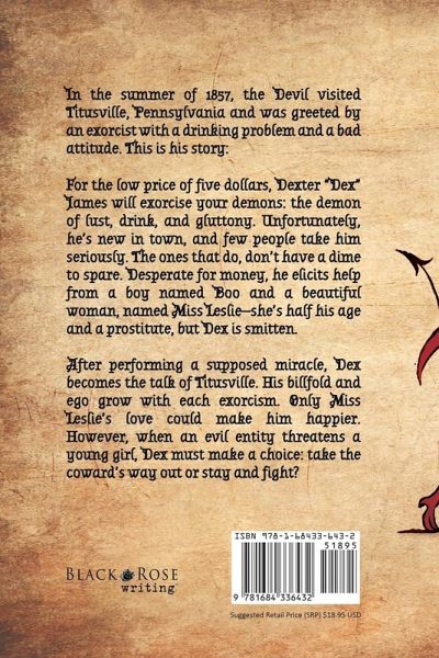 In the summer of 1857, the Devil visited Titusville, Pennsylvania and was greeted by an exorcist with a drinking problem and a bad attitude. This is his story: For the low price of five dollars, Dexter "Dex" James will exorcise your demons: the demon of lust, drink, and gluttony. Unfortunately, he's new in town, and few people take him seriously. The ones that do, don't have a dime to spare. Desperate for money, he elicits help from a boy named Boo and a beautiful woman, named Miss Leslie-she's half his age and a prostitute, but Dex is smitten. After performing a supposed miracle, Dex becomes the talk of Titusville. His billfold and ego grow with each exorcism. Only Miss Leslie's love could make him happier. However, when an evil entity threatens a young girl, Dex must make a choice: take the coward's way out or stay and fight?