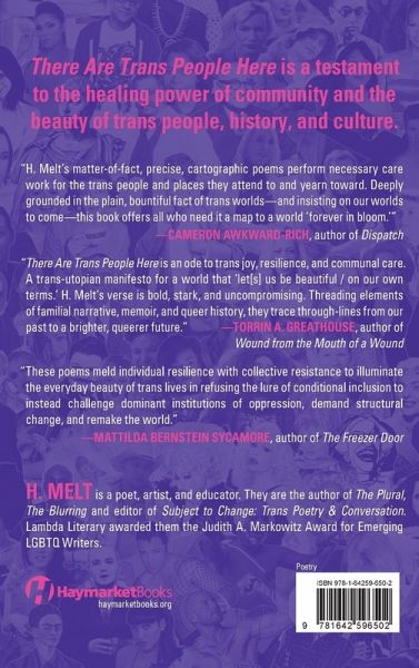 H. Melt is a poet, artist and educator who celebrates trans liberation. They are the author of The Plural, The Blurring and editor of Subject to Change: Trans Poetry & Conversation. Lambda Literary awarded them the Judith A. Markowitz Award for Emerging LGBTQ Writers.