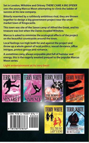 Set in London, Wiltshire and Orkney There Came A Big Spider sees the young Marcus Moon attempting to climb the ladder of success at his new company. Bitterly resented by a ruthlessly ambitious rival, they are thrown together to design a big government project near the small market town of Kingscastle. This town was site of the Saxon camp of Alfred the Great, and his treasure was lost when the Danes invaded WIltshire. Marucs is asked to minimize the ecological effects of the project on the beautiful countryside around the town. Local feelings run high both for and against the project and throw up a whole gamut of local politics, sexual deviance, office intrigue, protest groups and romance. A sometimes zany, always enjoyable plot full of humour and energy, this is the eagerly awaited prequel to the popular Marcus Moon series. Light entertainment at its very best!