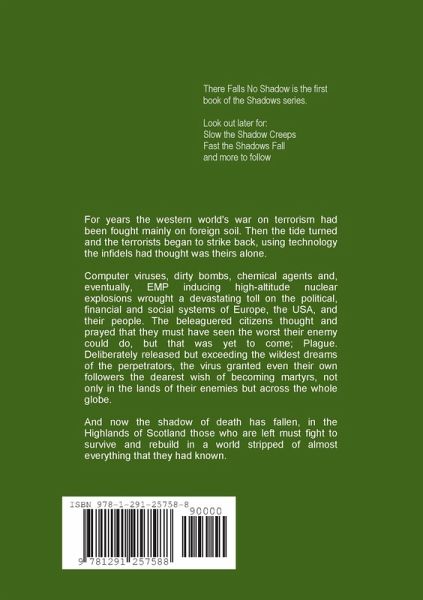 There Falls No Shadow is the first book in the Shadows series. Originally inspired by the 1970s television series Survivors, these books share the same concept of following the lives of the survivors of a global pandemic but in this case with totally different characters, locations, and storylines, and a 21st century setting. TFNS deals with the first year after the pandemic. It has been described as 'darker' than Survivors and filled with the realism that can only come from the first-hand knowledge, and sometimes horrifying experiences, that have been an inevitable part of the work and life of this author.