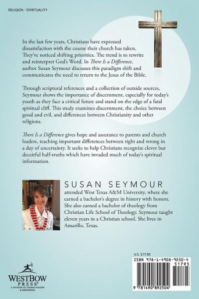 In the last few years, Christians have expressed dissatisfaction with the course their church has taken. They’ve noticed shifting priorities. The trend is to rewrite and reinterpret God’s Word. In There Is a Difference, author Susan Seymour discusses this paradigm shift and communicates the need to return to the Jesus of the Bible. Through scriptural references and a collection of outside sources, Seymour shows the importance of discernment, especially for today’s youth as they face a critical future and stand on the edge of a fatal spiritual cliff. This study examines discernment, the choice between good and evil, and differences between Christianity and other religions. There Is a Difference gives hope and assurance to parents and church leaders, teaching important differences between right and wrong in a day of uncertainty. It seeks to help Christians recognize clever but deceitful half-truths which have invaded much of today’s spiritual information.
