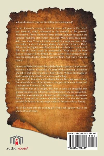 Whose skeleton is lying on the hilltop on Dooringrand? In the nineteenth century, a series of events took place in Port Natal and Zululand, which culminated in the downfall of the powerful Zulu nation. This is the story of three different cultures set against the turbulent backdrop of the Anglo-Zulu wars. Many questions are asked: Why were more Victoria Crosses awarded in a single encounter than ever before or since for bravery during the defense of Rorke's Drift? Why were the English so totally defeated the day before at Isandlwana? Why did the Zulus attack so unexpectedly? What caused the Boer farmers to align with the British, the very people whose oppressive rule they had escaped to Port Natal to get away from? And who is really the enemy? Journey with the little cattle boy who befriends a queen as he grows and becomes a warrior. Experience the ritual of the cleansing ceremonies and others that used to take place before battle. Witness his struggle in understanding the morality of warfare and killing. Experience the brutality and hardships that the Boer pioneers endured that sowed the seeds of the bitterness that gave birth to the hatred and cruel apartheid system of the future. Colonialism was at its height, and with it came an arrogance that ignored the needs and cultures of the inhabitants of any new acquisition. Learn how this attitude gave Britain one of its biggest and unnecessary defeats. It was also, by contrast, the stage for the most Victoria Crosses awarded for bravery for any single action in Britain's military history. All of this went into the melting pot of the rich tapestry that is the South Africa of today.