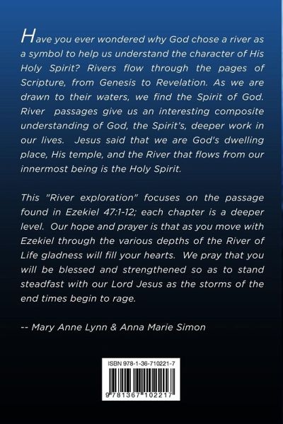 Have you ever wondered why God chose a river as a symbol to help us understand the character of His Holy Spirit? Rivers flow through the pages of Scripture, from Genesis to Revelation. As we are drawn to their waters, we find the Spirit of God. River passages give us an interesting composite understanding of God, the Spirit's, deeper work in our lives. Jesus said that we are God's dwelling place, His temple, and the River that flows from our innermost being is the Holy Spirit. This "River exploration" focuses on the passage found in Ezekiel 47:1-12; each chapter is a deeper level. Our hope and prayer is that as you move with Ezekiel through the various depths of the River of Life gladness will fill your hearts. We pray that you will be blessed and strengthened so as to stand steadfast with our Lord Jesus as the storms of the end times begin to rage. --Mary Anne Lynn & Anna Marie Simon