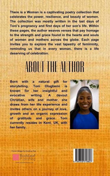 There is a Woman is a captivating poetry collection that celebrates the power, resilience, and beauty of women. The collection was mostly written in the last days of Toni's pregnancy and first days of her son's life. Within these pages, the author weaves verses that pay homage to the strength and grace found in the hearts and souls of women and mothers across the globe. Each page invites you to explore the vast tapestry of femininity, reminding us that in every woman, there is a life deserving of celebration.