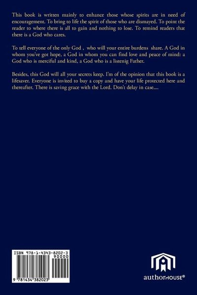This book is written mainly to enhance those whose spirits are in need of encouragement. To bring to life the spirit of those who are dismayed. To point the reader to where there is all to gain and nothing to lose. To remind readers that there is a God who cares. To tell everyone of the only God , who will your entire burdens share. A God in whom you've got hope, a God in whom you can find love and peace of mind: a God who is merciful and kind, a God who is a listenig Father. Besides, this God will all your secrets keep. I'm of the opinion that this book is a lifesaver. Everyone is invited to buy a copy and have your life protected here and thereafter. There is saving grace with the Lord. Don't delay in case....