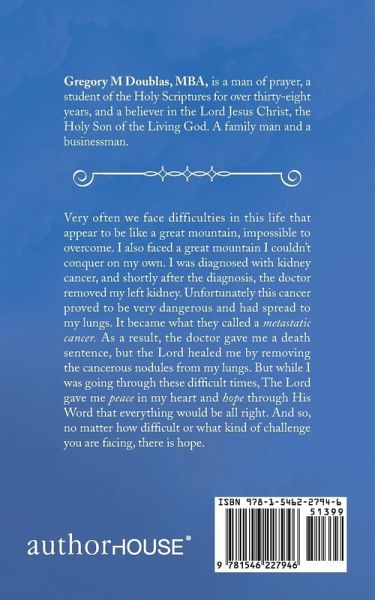 Very often we face difficulties in this life that appear to be like a great mountain, impossible to overcome. I also faced a great mountain I couldnt conquer on my own. I was diagnosed with kidney cancer, and shortly after the diagnosis, the doctor removed my left kidney. Unfortunately this cancer proved to be very dangerous and had spread to my lungs. It became what they called a metastatic cancer. As a result, the doctor gave me a death sentence, but the Lord healed me by removing the cancerous nodules from my lungs. But while I was going through these difficult times, The Lord gave me peace in my heart and hope through His Word that everything would be all right. And so, no matter how difficult or what kind of challenge you are facing, there is hope.