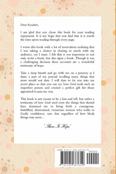 This is a part of the Author's journal that she has chosen to share as encouragement to those who come to a point of wondering if in their situation there is any hope. I am recalling some of the events of my life proving that in spite of the bleakness of your situations hidden in the shadows of despair is HOPE. If you have come to wonder if things can change please be assured that there is someone who understand this silent question and want you to know that truly...There Is Hope