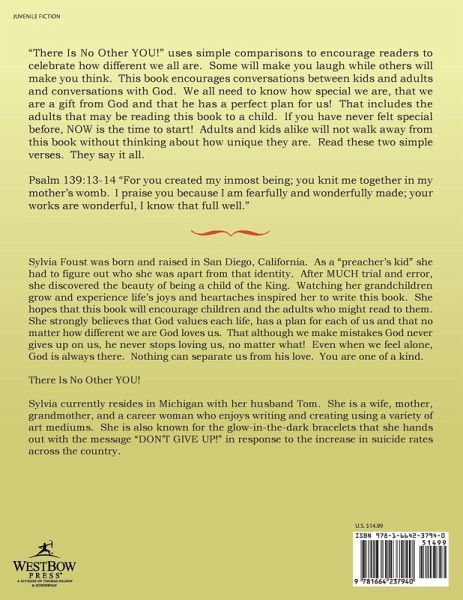 "There Is No Other YOU!" uses simple comparisons to encourage readers to celebrate how different we all are. Some will make you laugh while others will make you think. This book encourages conversations between kids and adults and conversations with God. We all need to know how special we are, that we are a gift from God and that he has a perfect plan for us! That includes the adults that may be reading this book to a child. If you have never felt special before, NOW is the time to start! Adults and kids alike will not walk away from this book without thinking about how unique they are. Read these two simple verses. They say it all. Psalm 139:13-14 "For you created my inmost being; you knit me together in my mother's womb. I praise you because I am fearfully and wonderfully made; your works are wonderful, I know that full well."