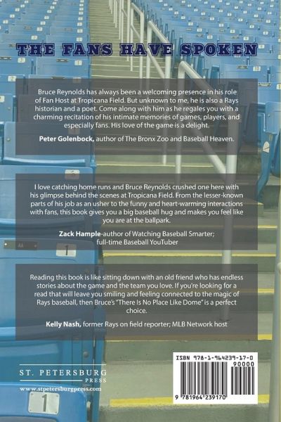 From beers to tears, a unique look at major league baseball games through the eyes of an usher at his beloved stadium. Follow Bruce, a 16-year veteran Tropicana Field Fan Host, as he leads you to your seat and navigates the world of the stands and the fans. A humorous and heartwarming insight into baseball, the stadium, the games, and the fans. From their cheers to crying in their beers, you will discover that there really is No Place Like Dome.