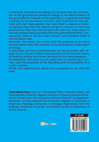 In questo libro, l'autore, tenendo conto anche del contributo dell'energia potenziale gravitazionale alla determinazione delle masse gravitazionali delle particelle in un campo gravitazionale (contrariamente all'erroneo uso comune), trova che per le particelle con massa a riposo maggiore di zero c'è sempre una velocità di fuga (minore della velocità della luce nel vuoto c) da qualsiasi campo gravitazionale e che le particelle con massa a riposo uguale a zero sono sempre libere di andare via da qualsiasi campo gravitazionale. Conseguentemente, non c'è alcun orizzonte degli eventi, e perciò non c'è alcun buco nero. Inoltre, l'autore mostra anche che la presenza di un orizzonte degli eventi implicherebbe la violazione del principio di conservazione dell'energia. In particolare, tutto questo è confermato anche dalla simmetria rispetto al tempo dell'equazione di campo di Einstein della Teoria della Relatività Generale e dalle soluzioni corrette di tale equazione. Conseguentemente, questo libro può essere utile anche per spiegare in un modo lineare la possibilità del Big Bang e la possibilità di un universo ciclico. Infine, i risultati sperimentali finora sono in accordo con questo libro.