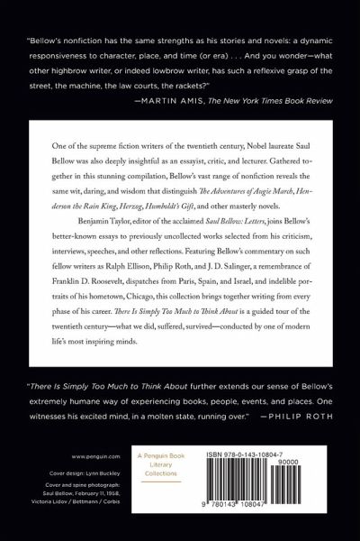 "Bellow's nonfiction has the same strengths as his stories and novels: a dynamic responsiveness to character, place, and time (or era) . . . And you wonder-what other highbrow writer, or indeed lowbrow writer has such a reflexive grasp of the street, the machine, the law courts, the rackets?" -Martin Amis, The New York Times Book Review One of the supreme fiction writers of the twentieth century, Nobel laureate Saul Bellow was also deeply insightful in his lesser-known roles as essayist, critic, and lecturer. Gathered together in this stunning compilation, Bellow's vast range of nonfiction reveals the same wit, daring, and wisdom that distinguish The Adventures of Augie March, Henderson the Rain King, Herzog, Humboldt's Gift, and other masterly novels. In There Is Simply Too Much to Think About, as in the novels, the twentieth century comes fiercely to life through Bellow's unrivaled human understanding and singular style. Benjamin Taylor, editor of the acclaimed Saul Bellow: Letters, joins Bellow's better-known essays to previously uncollected works selected from his criticism, interviews, speeches, and other reflections. Featuring Bellow's commentary on such fellow writers as Ralph Ellison, Philip Roth, and J. D. Salinger, a remembrance of Franklin D. Roosevelt, dispatches from Paris, Spain, and Israel, and indelible portraits of his hometown, Chicago, this collection brings together writing from every phase of his career. There Is Simply Too Much to Think About is a guided tour of the twentieth century-what we did, suffered, survived-conducted by one of modern life's most inspiring minds.