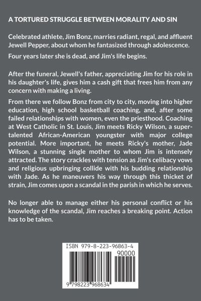 A TORTURED STRUGGLE BETWEEN MORALITY AND SIN Celebrated athlete, Jim Bonz, marries radiant, regal, and affluent Jewell Pepper, about whom he fantasized through adolescence. Four years later she is dead, and Jim's life begins. After the funeral, Jewell's father, appreciating Jim for his role in his daughter's life, gives him a cash gift that frees him from any concern with making a living. From there we follow Bonz from city to city, moving into higher education, high school basketball coaching, and, after some failed relationships with women, even the priesthood. Coaching at West Catholic in St. Louis, Jim meets Ricky Wilson, a super-talented African-American youngster with major college potential. More important, he meets Ricky's mother, Jade Wilson, a stunning single mother to whom Jim is intensely attracted. The story crackles with tension as Jim's celibacy vows and religious upbringing collide with his budding relationship with Jade. As he maneuvers his way through this thicket of strain, Jim comes upon a scandal in the parish in which he serves. No longer able to manage either his personal conflict or his knowledge of the scandal, Jim reaches a breaking point. Action has to be taken.