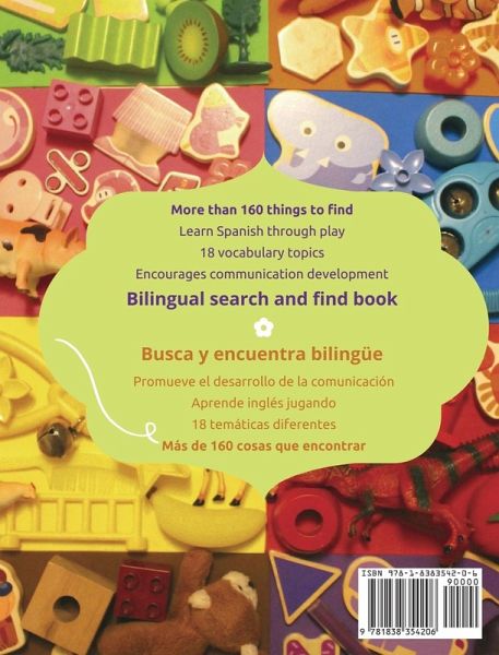 Bilingual Search and Find Book in English and SpanishLearn Spanish through play More than 160 things to find Encourages communication development 18 vocabulary topics: home, food, animals, colours, numbers, clothes, instruments, toys and many more! With colourful, photographic images labelled in English and Spanish in different colour codes. All individually listed items can be found by children in a big topic scene. Promotes new vocabulary acquisition in both languages, bilingual and foreign language education and early word-image recognition. There's lots to explore and talk about! ~ Busca y Encuentra bilingüe en inglés y españolAprende inglés jugando Más de 160 cosas que encontrar Promueve el desarrollo de la comunicación 18 temáticas diferentes: casa, comida, animales, colores, números, ropa, instrumentos, juguetes, ¡y muchos más!