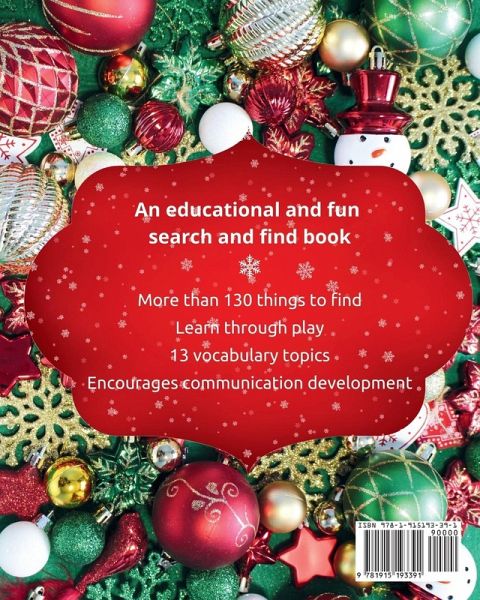 This educational Christmas children's book provides lots of different challenges to keep kids engaged during the festive season while learning and having fun at the same time. ¿ A book they will pick over and over again as it has many things to discover. Over 130 words and items to find improve their vocabulary and helps with language acquisition. ¿ Real-life images of Christmassy objects encourages them to join the conversation and develop their communication skills. Learning through play at Christmas is possible with a search and find book full of fun topics: decorations, lights, animals, baubles, Christmas trees, clothes, cards and many more! *Bilingual edition English-Spanish also available. This is the English-only edition*