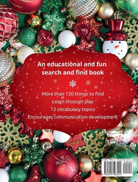 This educational Christmas children's book provides lots of different challenges to keep kids engaged during the festive season while learning and having fun at the same time. ¿ A book they will pick over and over again as it has many things to discover. Over 130 words and items to find improve their vocabulary and helps with language acquisition. ¿ Real-life images of Christmassy objects encourages them to join the conversation and develop their communication skills. Learning through play at Christmas is possible with a search and find book full of fun topics: decorations, lights, animals, baubles, Christmas trees, clothes, cards and many more! *Bilingual edition English-Spanish also available. This is the English-only edition*