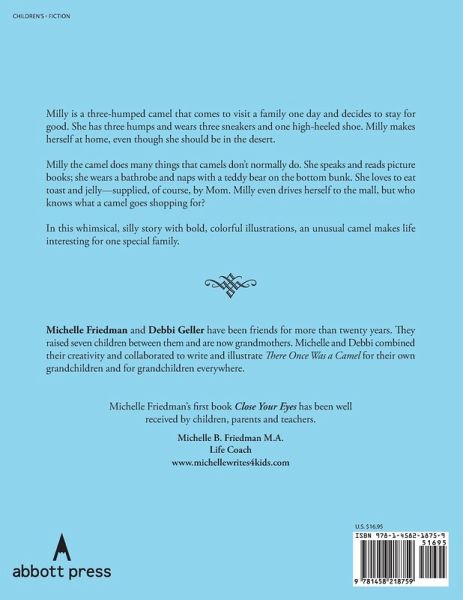 Milly is a three-humped camel that comes to visit a family one day and decides to stay for good. She has three humps and wears three sneakers and one high-heeled shoe. Milly makes herself at home, even though she should be in the desert. Milly the camel does many things that camels don't normally do. She speaks and reads picture books; she wears a bathrobe and naps with a teddy bear on the bottom bunk. She loves to eat toast and jelly--supplied, of course, by Mom. Milly even drives herself to the mall, but who knows what a camel goes shopping for? In this whimsical, silly story with bold, colorful illustrations, an unusual camel makes life interesting for one special family.