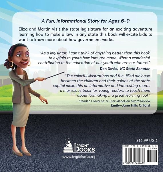 There Ought to be a Law-A Bright Day at the State Capitol is a fun, informational picture story book for ages 6-9 about how bills become laws. The illustrated story takes Eliza and Martin on a visit to the state legislature. At the Capitol, in a playful, yet serious, way they create an anti-bullying bill, with a free ice cream amendment, and take it through the 12 steps required to become a law. Eliza and Martin learn all about the state Capitol and its workings, meeting interesting people along the way. The youth see the role government plays in their lives. The story helps Eliza and Martin think about and appreciate rules in their own home, school, and community. Grab your copy now and let the adventure begin!