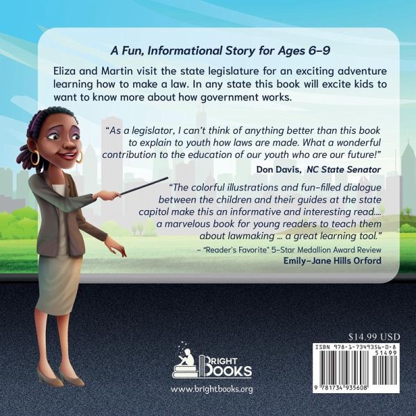 There Ought to be a Law-A Bright Day at the State Capitol is a fun, informational picture story book for ages 6-9 about how bills become laws. The illustrated story takes Eliza and Martin on a visit to the state legislature. At the Capitol, in a playful, yet serious, way they create an anti-bullying bill, with a free ice cream amendment, and take it through the 12 steps required to become a law. Eliza and Martin learn all about the state Capitol and its workings, meeting interesting people along the way. The youth see the role government plays in their lives. The story helps Eliza and Martin think about and appreciate rules in their own home, school, and community. Grab your copy now and let the adventure begin!