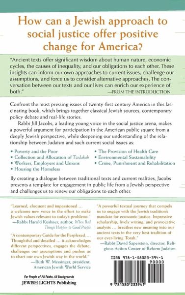 How can a Jewish approach to social justice offer positive change for America? "Ancient texts offer significant wisdom about human nature, economic cycles, the causes of inequality, and our obligations to each other. These insights can inform our own approaches to current issues, challenge our assumptions, and force us to consider alternative approaches. The conversation between our texts and our lives can enrich our experience of both." -from the Introduction Confront the most pressing issues of twenty-first-century America in this fascinating book, which brings together classical Jewish sources, contemporary policy debate and real-life stories. Rabbi Jill Jacobs, a leading young voice in the social justice arena, makes a powerful argument for participation in the American public square from a deeply Jewish perspective, while deepening our understanding of the relationship between Judaism and such current social issues as: Poverty and the Poor Collection and Allocation of Tzedakah Workers, Employers and Unions Housing the Homeless The Provision of Health Care Environmental Sustainability Crime, Punishment and Rehabilitation By creating a dialogue between traditional texts and current realities, Jacobs presents a template for engagement in public life from a Jewish perspective and challenges us to renew our obligations to each other.