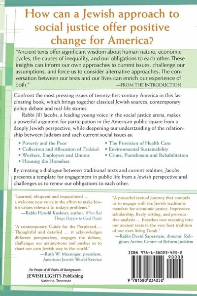 How can a Jewish approach to social justice offer positive change for America? "Ancient texts offer significant wisdom about human nature, economic cycles, the causes of inequality, and our obligations to each other. These insights can inform our own approaches to current issues, challenge our assumptions, and force us to consider alternative approaches. The conversation between our texts and our lives can enrich our experience of both." -from the Introduction Confront the most pressing issues of twenty-first-century America in this fascinating book, which brings together classical Jewish sources, contemporary policy debate and real-life stories. Rabbi Jill Jacobs, a leading young voice in the social justice arena, makes a powerful argument for participation in the American public square from a deeply Jewish perspective, while deepening our understanding of the relationship between Judaism and such current social issues as: Poverty and the Poor Collection and Allocation of Tzedakah Workers, Employers and Unions Housing the Homeless The Provision of Health Care Environmental Sustainability Crime, Punishment and Rehabilitation By creating a dialogue between traditional texts and current realities, Jacobs presents a template for engagement in public life from a Jewish perspective and challenges us to renew our obligations to each other.