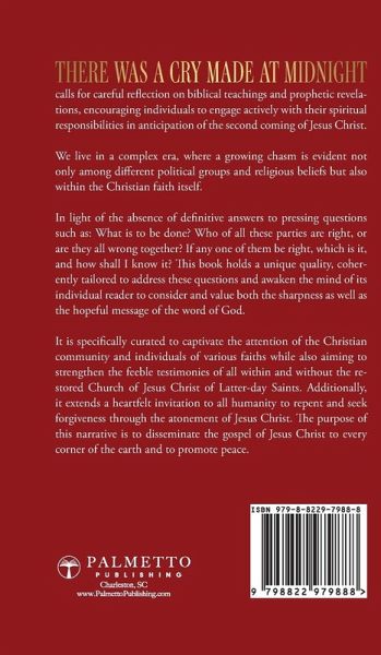 There was a Cry made at Midnight utilizes biblical prophecies to underscore the plan of salvation and assists its audience in recognizing the signs of the times. It testifies of Jesus Christ and presents the teachings of his restored gospel, specifically as revealed to Joseph Smith and his successors. The text unfolds the realities of our pre-mortal existence, discussing the significance of living prophets and their role in guiding believers in the contemporary world. It emphasizes the importance of the Book of Mormon, presented as a key scriptural companion to the Bible that complements and…mehr