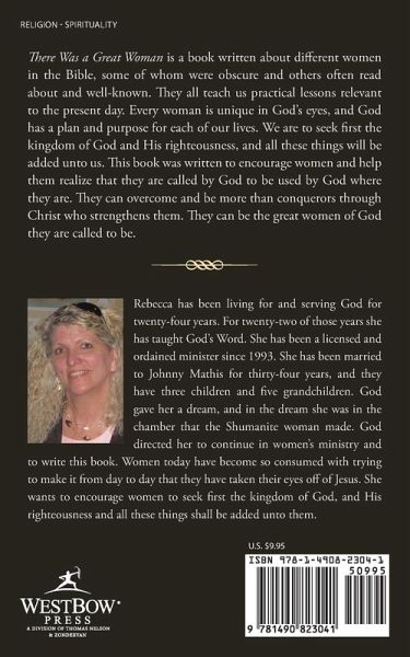 There Was a Great Woman is a book written about different women in the Bible, some of whom were obscure and others often read about and well-known. They all teach us practical lessons relevant to the present day. Every woman is unique in God's eyes, and God has a plan and purpose for each of our lives. We are to seek first the kingdom of God and His righteousness, and all these things will be added unto us. This book was written to encourage women and help them realize that they are called by God to be used by God where they are. They can overcome and be more than conquerors through Christ who strengthens them. They can be the great women of God they are called to be.
