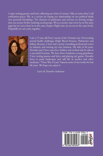 I enjoy writing poems and lyrics reflecting my views of society. I like to write what I call unification pieces. We, as a society are basing our relationships on our political ideals over personal friendships. The theatrics of politicians and activists are driving wedges into our society further isolating social groups. We as a society, may never be on the same page but we can at least be in the same chapter. Right now, we are not in the same book. Hopefully we can come I am a 72 year old Navy veteran of the Vietnam war. Overcoming several health challenges (High Blood Pressure, Parkinson's and kidney decease), I have had a pretty rewarding professional career in industry and owning my own business. My wife of 46 years, Dorothy and I have raise four children and worked side by side in a successful business. We have three handsome young grandsons. I love writing poems and lyrics and playing my guitar. Dorothy loves to paint landscapes and still life in acrylics and other mediums. "There Was A Lane" features some of our works the last 46 years. We hope you enjoy it. Larry & Dorothy Anderson