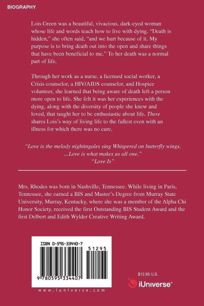 Lois Green was a beautiful, vivacious, dark-eyed woman whose life and words teach how to live with dying. "Death is hidden," she often said, "and we hurt because of it. My purpose is to bring death out into the open and share things that have been beneficial to me." To her death was a normal part of life. Through her work as a nurse, a licensed social worker, a Crisis counselor, a HIB/AIDS counselor, and Hospice volunteer, she learned that being aware of death left a person more open to life. She felt it was her experiences with the dying, along with the diversity of people she knew and loved, that taught her to be enthusiastic about life. There shares Lois's way of living life to the fullest even with an illness for which there was no cure.