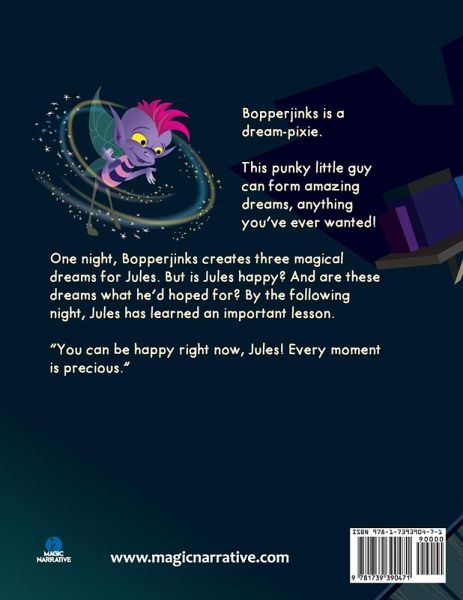 This gorgeous picture book tells the story of a young boy's journey to finding happiness, gratitude, and discovering mindfulness. A charming story that combines stunning illustrations with a heartwarming message of hope and joy, perfect for sharing with young children. Jules lives in a houseboat with his mum, his Grandpa Otto and his pet cat, Basil, on a canal in a busy city. Everyone there is rushing about with no time to waste. "I wish I was that important!" thinks Jules. But nobody notices him. Bopperjinks is a dream-pixie. This punky little guy can form amazing dreams, anything you've ever wanted! One night, Bopperjinks creates three magical dreams for Jules. Will these dreams be what he'd hoped for? By the following night, Jules has learned an important lesson. "You can be happy right now, Jules! Every moment is precious."