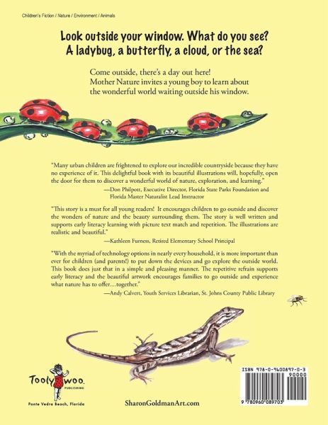 Mother Nature invites a young boy to explore the wonderful world waiting outside his window where he can see and learn about ladybugs, lizards, butterflies, birds, trees, clouds, and much more. This beautifully illustrated children's picture book will encourage families to discover outdoor environments in their yard and neighborhood-rain or shine.
