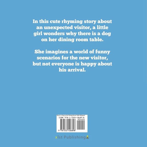 Bilingual Edition: There's a Dog on the Dining Room Table In this cute rhyming story about an unexpected visitor a little girl wonders why there is a dog on her dining room table. She imagines a world of funny scenarios for the new visitor, but not everyone is happy about his arrival. In this Xist Kids English Spanish Bilingual Edition, the original English text is paired with the Spanish translation on each page.